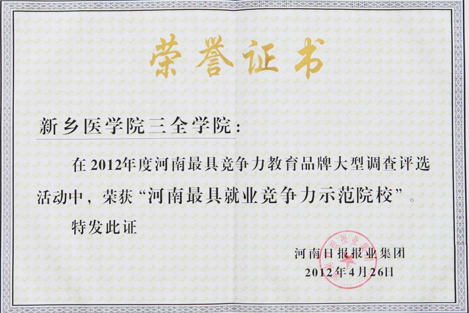 我院始终坚持“以学生为本”的思想,牢牢把握“一切为了学生就业,为了一切学生就业”的工作主线,迎难而上,勇于创新,在国内大学生就业形势最严峻的时期,学院经受市场考验,实现就业率稳步攀升,2008年学院首届毕业生就业率达到89.32%,2009年1028名毕业生就业率为91.54%,2010年1873名毕业生就业率91.94%。2011年2141名毕业生就业率92.01%, 2011年在河南省教育厅组织的“毕业生就业工作评估”中,获得“优秀”称号,赢得了上级领导和社会各界的认可和好评。