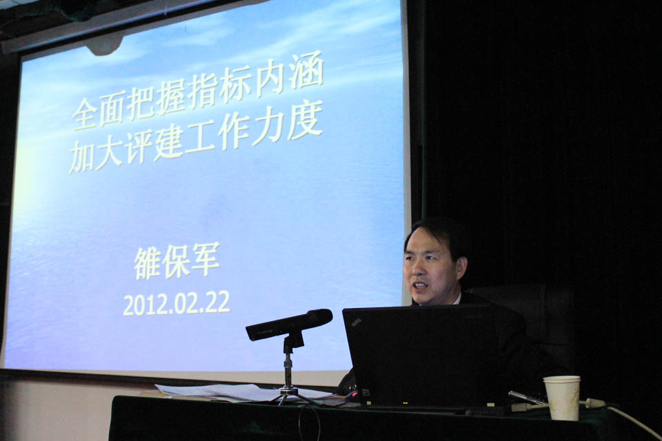 王彦杰致欢迎词,他热烈欢迎雒保军教授前来讲课。雒保军教授以“全面把握指标内涵,加大评建工作力度”为主题,从为什么评估、评估目的指导思想、体系设计特点、结论认定、内涵理解、做好评建工作等六个方面对评估做了全面介绍,并结合我院实际发表自己见解。他指出:做好评建工作,要在思想上高度重视,把认识统一到正确的方向上来,明确评估的根本目的,精心组织,积极稳妥推进教育合格评估各项工作,正确处理好“硬件建设”和“软件建设”的关系,以平常心对待评估工作。