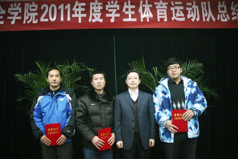 王洪兴宣读《关于表彰2011年度我院优秀学生体育运动队、教练员、运动员的决定》。学院决定,授予武术队、女子排球队、女子篮球队3支学生体育运动队“优秀体育运动队”称号,授予齐琦、凌文杰、蒋广涛等9位同志“优秀教练员”称号,授予朱光举、夏文斌、吴琪、何剑明、胡靖等60位同学“优秀运动员”称号。王金文、王洪兴分别为优秀体育运动队、优秀教练员代表及优秀运动员代表颁奖。优秀教练员代表蒋广涛及优秀运动员代表冯妍分别发言。