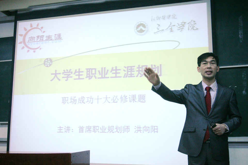 晚上,应大学生职业发展协会邀请,洪向阳为我院大学生作了一场生动的大学生职业生涯规划讲座。洪向阳主讲内容包括“为何职业规划关系大学生的核心利益”、“大学生的职业规划主要有哪些内容”、“大学生的职业规划该怎么做”、“向阳生涯规划与职业定位模型简介”和“大学生职场成功的十大必修课”五个问题。洪向阳指出,当今大学生就业难的三大原因是定位不清目标不明,缺乏核心竞争力和工作主动性差,他认为职业规划是解决就业问题的根本之道。