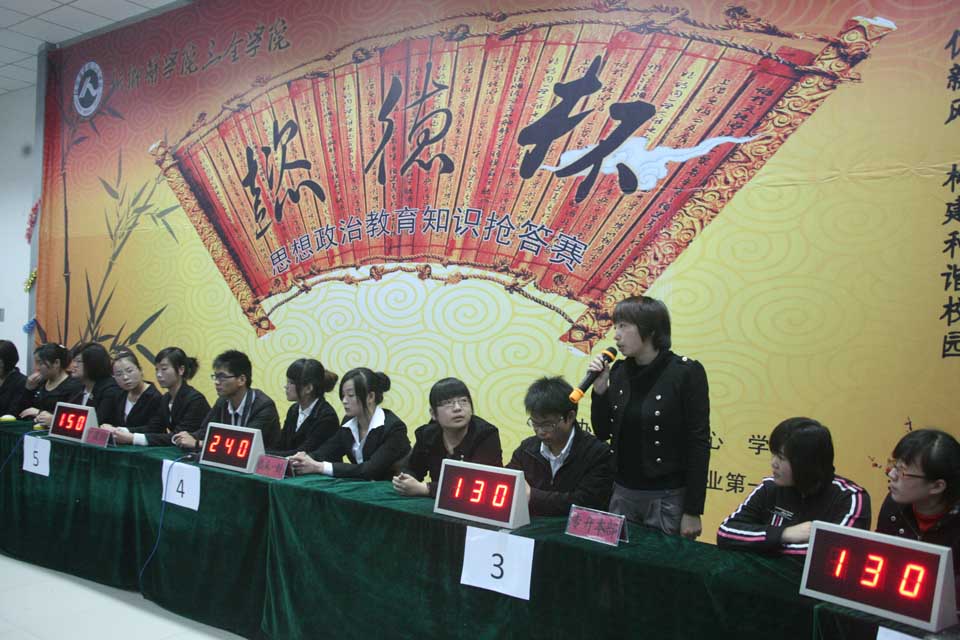 经过层层选拔,共来自我院各学生管理分部的七支代表队21名同学进入决赛。比赛分为必答题、抢答题、风险题三个环节。必答题环节中,各代表队从容应对,精准作答,势均力敌;抢答题环节考察学生的知识面和反应速度,各选手机敏睿智的表现博得现场观众的阵阵掌声;在风险题环节中,选手们大胆挑战“答错扣分”的高额风险题,比分不停变换,让结果充满了悬念。比赛中还穿插了琵琶独奏、小品等节目,其中小品《感恩的心》以真挚感人的表演、深刻的主题打动了现场观众。
