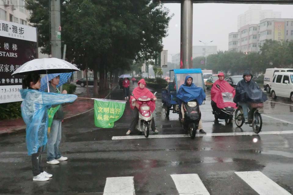 虽然天公不作美,秋日清晨的空气中夹杂着丝丝凉意,志愿者们依然时刻注意着变动的红绿灯并及时制止违反交通法规的行人,他们手中的旗子和肩头的绿色丝带渐渐被雨水打湿,身体也因为寒冷不住地颤抖,但却是街头的一道靓丽风景。过往的市民有人微笑着频频点头,有人积极地配合着他们的工作,他们在雨幕中完美的诠释了本次活动的意义,让每一位过往的市民意识到“安全出行,重于泰山”。