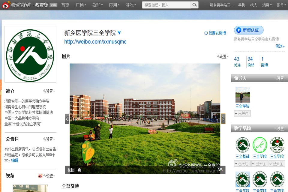 新乡医学院三全学院新浪微博作为目前代表我院的唯一正式官方微博,将采用生动活泼、简洁明快的形式,及时发布学院最新动态、记录学院重大新闻事件、展示学院发展成就、彰显学院发展特色、凝聚校友力量,力争使之成为广大师生、校友和社会各界了解学院、关注学院的重要平台和展示学院形象、加强对外交流与沟通的“重要窗口”。