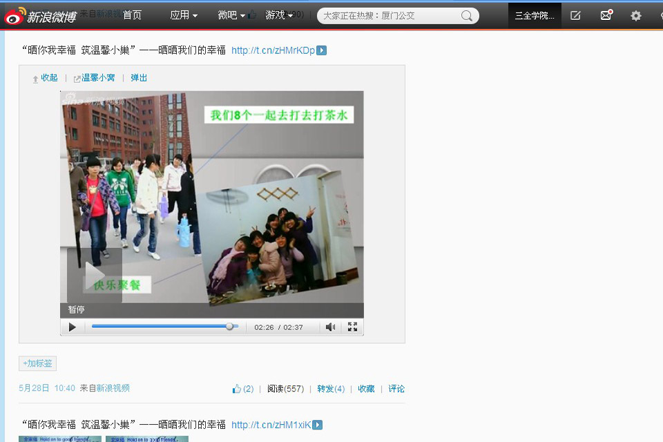 “晒你我幸福 筑温馨小巢”——大型宿舍心理健康行动自5月20日发出征集令以来,共征集到713个宿舍的精美作品。本次活动以宿舍为单位,在同学间广泛征集以“幸福、温馨、快乐、感动”为主题的宿舍作品(PPT或视频),并于5月28日至6月7日期间以班级课前五分钟、公寓楼电子屏、网络微博等形式进行展示,给同学们创造了一个展示宿舍幸福的平台,使广大同学对融洽的宿舍关系有了更深刻的体验,宿舍关系变得更加和谐。