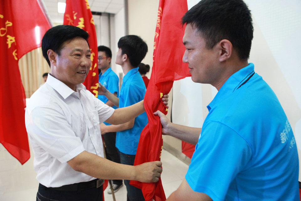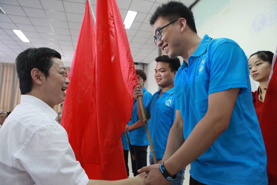 仪式开始,王志凯发表重要讲话。在讲话中,他对学院各院系进行社会实践给予肯定并寄予厚望,并提出五点希望和要求:一、要通过实践,进一步坚定中国特色社会主义道路的理想和信念;二、要在艰苦环境中磨炼意志品质,增强服务社会的本领;三、要谦虚谨慎,在向实践和群众学习中增长才干;四、要精心组织,确保实践活动安全有序进行;五、要注重宣传,塑造品牌,做好成果总结。接下来,社会实践团队指导老师代表常青和学生代表牛含青分别发言,她们从老师和学生的角度明确了社会实践的角色要求和工作原则,承诺严格按照院领导部署,把时时作为锻炼之机,把处处作为锻炼之地,与时俱进,开拓创新,积极投身大学生暑期社会实践活动中。随后,进行授旗仪式。由王志凯和王金文对社会实践团队队长授旗。