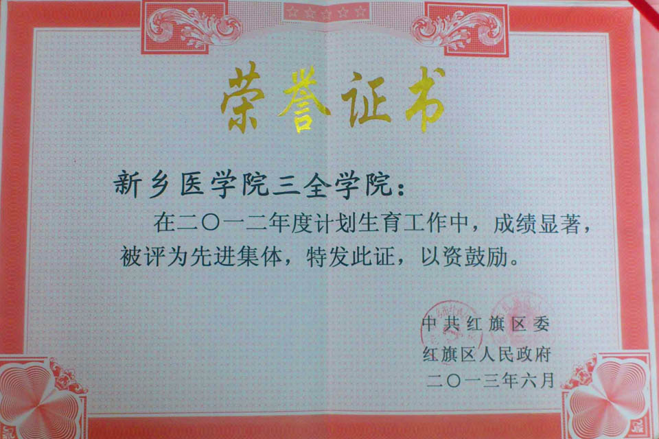 6月24日,中共红旗区委、红旗区人民政府隆重召开2012年度计划生育奖惩暨创建国家计划生育优质服务区动员大会。我院在2012年度人口和计划生育工作中成绩显著,表现突出,被授予“人口和计划生育工作先进集体”荣誉称号。