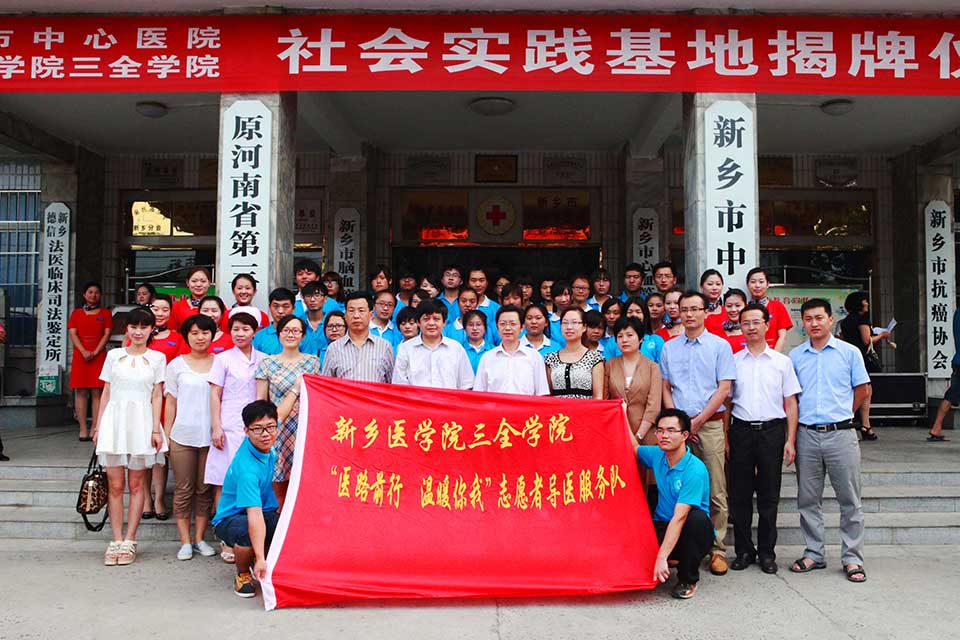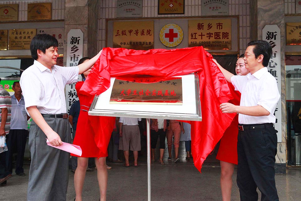 7月15日上午,临床学院暑期社会实践基地揭牌仪式在新乡市中心医院门诊大楼前举行。新乡市中心医院领导与我院领导对此次实践基地的建立给予了高度重视。出席本次揭牌仪式的有我院党委副书记王金文、新乡市中心医院副院长王培山,我院团委书记王俊萍、中心医院团委书记宋予伟,我院临床学院党总支副书记徐超以及临床学院参加“医路前行,温暖你我”导医活动的全体队员。