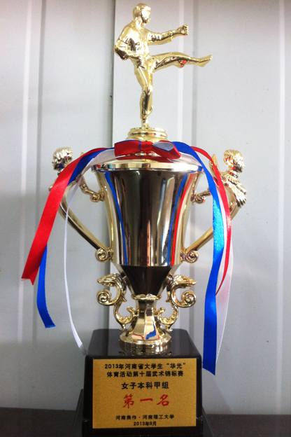 927日上午11时,河南省大学生“华光”体育活动2013年系列体育竞赛第十届武术锦标赛在河南理工大学圆满落幕。我院武术运动队再创佳绩,在河南警察学院、河南财经政法大学、河南理工大学、洛阳理工学院等14组本科团队勇获本科甲组女子团体第一名。