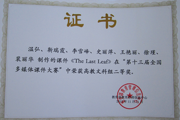 我院温弘、靳瑞霞、李雪峰老师作品《The Last Leaf》在全国决赛以优异的发挥,获得二等奖,是我院首个文科类大奖。我院杨慈清、李小英、石晓卫老师在北京决赛,作品《DNA复制、RNA转录和蛋白质翻译》获得三等奖,王静(微课程)、鲁世清、张业宏、白瑞樱、张光谋、高启禹、李勇莉的7件作品获得全国课件大赛优秀奖。