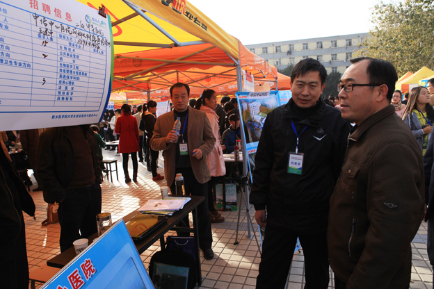 1116日,2014届河南省医学卫生类大中专毕业生就业双向选择洽谈会(冬季)在新乡医学院南校区隆重举行。本次洽谈会共吸引了来自省内外的346家用人单位前来参加,涵盖临床医学、护理、医学影像学、药学、生物工程、英语等多个专业,共提供就业岗位8134个。全省医学院校4000余名医学卫生类毕业生参加了洽谈会。我院副院长王维勋亲临洽谈会现场,看望求职学生及用人单位,亲切询问了参会同学们的求职状况,并且与用人单位的工作人员进行了交谈,了解各单位对人才的需求现状,以及对学校人才培养的意见和建议。