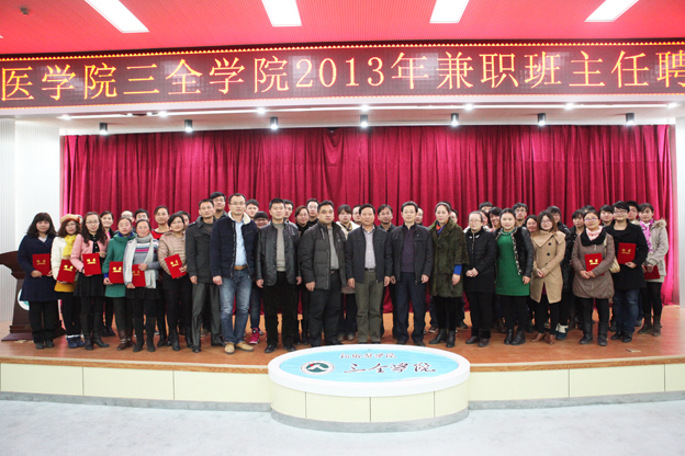 本次兼职班主任选聘工作是继我院在基础医学院开展首批兼职班主任试点工作后在各院系2013级全体班级中的全面推广。此次选聘为我院8个院系的132个2013年新入学班级配置了69位同志担任兼职班主任。仪式上,张钢宣读了《新乡医学院三全学院班主任工作条例》,王金文宣读了《关于聘任苗莹莹等69名教师担任兼职班主任的决定》,各院系党政领导分别为本院系新聘兼职班主任颁发了聘书。