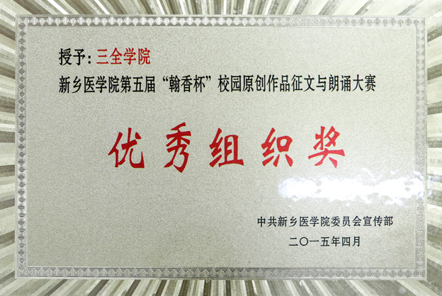 4月23日晚,由新乡医学院主办的第五届“翰香杯”校园原创作品朗诵大赛正式拉开帷幕,我院荣获优秀组织奖。