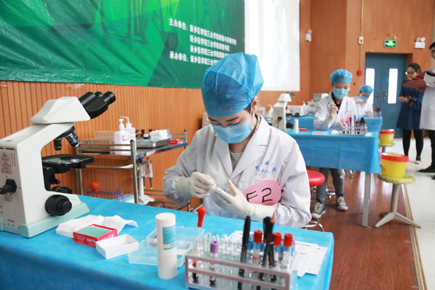 比赛现场设有四个实验操作台,有显微镜、微量移液枪、试管等多种实验器材。比赛全程实时现场直播,选手的操作细节清晰地显示在现场两个大屏幕上。比赛共设有微课程展示、静脉采血、血涂片制备、白细胞计数、血红蛋白测定、有问必答6个环节。“一针见血”静脉采血环节中,各选手屏住呼吸,表情严肃,动作迅速规范,做到了真正的“一针见血”; “心灵手巧”血涂片制备环节,参赛同学按要求进行手指采血,制作出相应的血涂片,进行染色观察,并在规定时间得出实验结果,同时还要进行血型鉴定以及倍比稀释试验,评委老师检查过每个显微镜后给出分数;有问必答环节选手们在答题纸上写出细胞名称,选手们的高正确率赢得全场同学的热烈掌声。