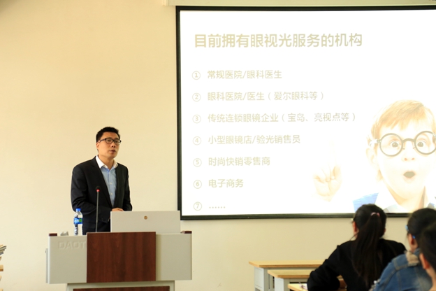 上午9时30分,星创视界宝岛眼镜总经理魏举、宝岛眼镜(郑州)副总经理邓仁丙、宝岛眼镜总部专业事务部主管连捷、宝岛眼镜(郑州)指教部主管马俊磊一行四人来到学院,并参观了学院第一教学楼。随后,一行人来到C303教室,与我院眼视光专业学生进行了关于视光行业未来发展的互动讨论。