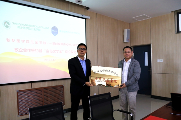 下午14时30分,院长杨捷、副院长王洪兴在基础楼四楼会议室,接见了星创视界一行人,双方就未来合作的发展方向及合作的细节进行洽谈。杨捷和王洪兴分别致辞,并表达了建立长久合作的良好愿望及对未来合作共赢的信心。随后,双方签订了校企合作协议。杨捷与魏举互授“新乡医学院三全学院实践就业基地”与“星创视界(中国)产学研基地”牌匾。签约仪式在和谐融洽的氛围中圆满结束。