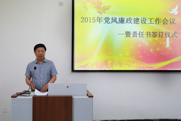 5月21日上午,学院召开 2015年度党风廉政建设工作会议,学院党委书记王志凯,党委副书记王金文、张钢,副院长王洪兴、沈雁霞出席,全院各单位负责人参加。纪检监察审计部主任马引连主持会议。