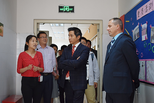 会谈结束,Michael一行在樊永兵等人的陪同下前往精诚书院、基础医学院、护理学院等地进行参观交流。精诚学子全英文交流与介绍书院文化、显微数码互动实验室先进的教学方法、设备精良的国际护理培训中心以及丰富多彩的校园社团文化生活给Michael一行留下了深刻印象。