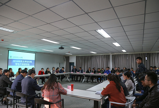 与会领导首先向学生代表介绍了开展民主评议学校行风工作的背景、目的、意义以及工作方法等,并就评议的具体内容进行了较为详细的说明,要求大家认真评议,实事求是地提出对学院在校风建设、教风建设、学风建设、师德师风建设、机关作风建设方面的要求和建议,以改进学院各项工作,促进学院进一步发展。