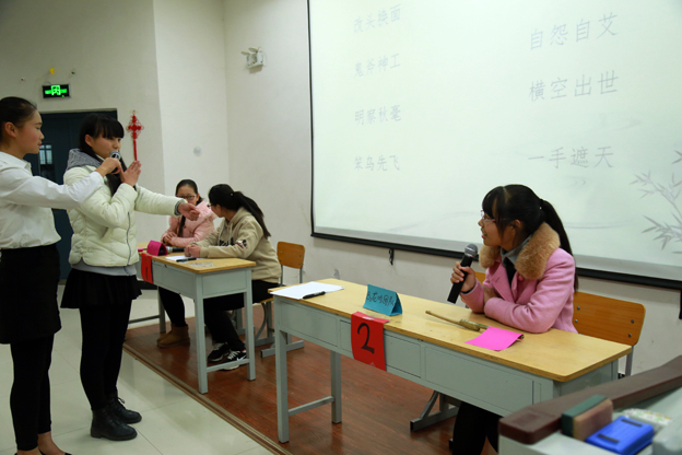 比赛伊始,主持人介绍到,成语是中国传统文化的浓缩精华,汉字文化博大精深,蕴含着大量的文化信息,了解成语、熟悉成语,就是了解和熟悉祖国的传统文化。比赛分为半决赛和决赛两个部分,首先是半决赛,裁判念题文选手举牌抢答,赛场上,参赛队员聚精会神听题,在听到“请抢答”后,迅速举起自己手中的抢答牌进行抢答。他们用深厚的成语功底巧妙地应对裁判的各种问题和“刁难”,精彩的表现使现场气氛持续升温,掌声不断。最终,龙吟队、智联队、答的都对队、热火队晋级决赛。决赛分为“你说我猜”,“双音节同题”, “火眼金睛”三个环节, “你说我猜”环节将比赛的趣味性与知识性有机地结合起来,比赛过程中队友间默契的配合,幽默诙谐的描述和抢答、机智的表现赢得了现场观众的阵阵掌声和喝彩声,也将本次比赛推向高潮。经过激烈角逐,智联队、热火队和龙吟队分别获得本次比赛的冠、亚、季军。