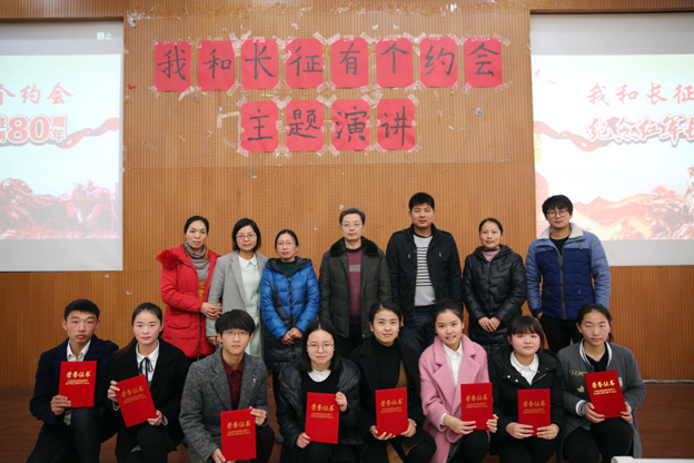 翻拍红色经典,重温长征精神。本次比赛历时半个月,同学们以班级为单位重新翻拍红色经典照片。经过初赛选拔、微信投票等方式共选出八名不同专业班级的发言人进入决赛。演讲环节,各位选手结合自己演讲比赛所精心制作的PPT,从不同的角度讲述自己班级翻拍照片时的想法与感悟,真切地感受先辈们艰苦而伟大的革命历程。参赛选手言辞流利,或真挚朴实,或慷慨激昂,畅谈自己对长征精神的理解和照片背后的故事。同时,自己班级齐心协力去翻拍这些照片也收获了友谊和默契。在主持人提问环节,学生们积极踊跃的回答,表达出了自己对长征精神的理解和对革命先辈的缅怀。经过激烈角逐,陶梦圆获得一等奖,勾瑞雪、詹伟航获得二等奖,刘琦、李成钰获得三等奖。