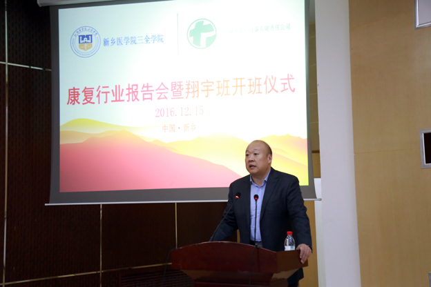 12月15日下午,我院在平原校区行政楼学术报告厅举行首届“翔宇班”开班仪式。翔宇医疗设备有限责任公司总董事长何永正、人力资源部部长李治锋、董事长秘书周健、我院党委书记王志凯、副书记王金文、副院长王彦杰、教务长杜华贞出席,新乡医学院第一附属医院康复科主任郭学军、我院相关部门负责人以及“翔宇班”学员、相关专业两百余名同学共同参加了此次开班仪式,仪式由院长办公室主任史世锋主持。