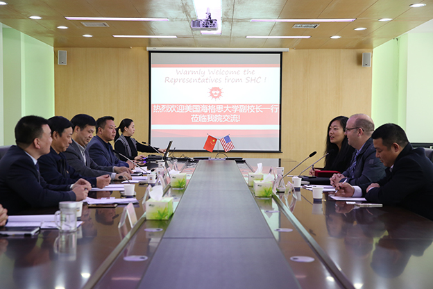 Blaine充分肯定了我院的人才培养模式,认为两校无论从专业设置,还是在办学定位上都有许多共通之处。同时,Blaine也向我院领导介绍了海格思大学的办学历史、校区设置、专业设置、学生就业等方面的基本情况。在谈到教学特色时,他强调到,海格思大学的办学宗旨是“使学生们有更好的职业生涯”,并且此宗旨自海格思大学建校来从未改变。