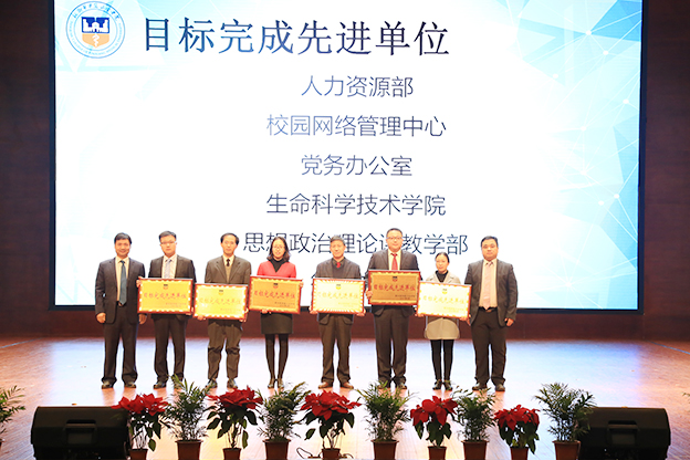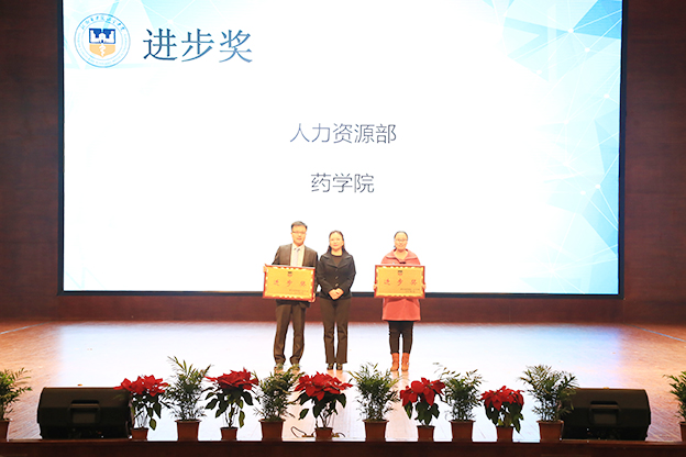 会议首先表彰了“2016年度十佳人物”:郭立喜、张紫阳、翟莎莎、郝诗亮、李剑、刘璐、李薇、卢明臣、杨杰、刘巨源;“目标完成先进单位”:人力资源部、校园网络管理中心、党务办公室、生命科学技术学院、思想政治理论课教学部、德馨书院;“进步奖”:人力资源部和药学院;“创新项目奖”:教务部、护理学院、羲和书院;“董事长特别奖”:拼命“三”郎---防汛抢险团队、新媒体“尔玉”---王玺秀。院领导依次为获奖单位和个人颁奖。
