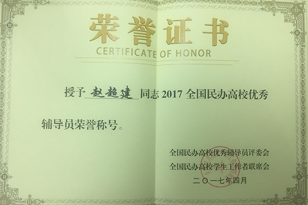 “全国民办高校优秀辅导员” 由全国民办高校学生工作者联席会组织评选,全国共有139所高校参评。我院崇德书院辅导员赵超建凭借其良好的政治素养、扎实的理论功底及较强的业务能力脱颖而出,获得殊荣,充分展示了在院系+书院的“双院制”育人模式下,我院始终重视辅导员队伍建设,实行学工队伍等级化管理,加大对学工队伍专业化的培养,逐步引导学工管理模式由“保姆管理型”向“教研管理型”转变,为每一位辅导员的职业发展做好规划。