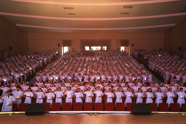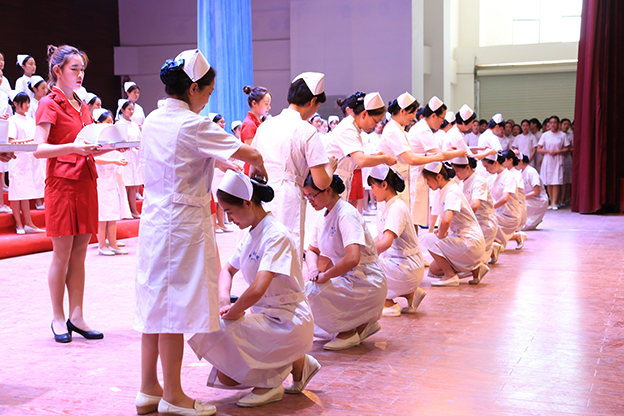 活动开始,参与合唱的白衣天使们分成两个方阵,微微倾斜,如同两只雪白的翅膀,提灯女神从中缓缓走出。授帽仪式在优美、安祥的“only time”乐曲声中开始。象征着传递火种的女神手提式火种台灯款款走上舞台,薛松梅教授走上台引燃火种点燃烛台。114名实习生代表身着洁白的护士服,依次缓缓走入会场,单膝跪地,虔诚地迎接着这一神圣时刻的到来。来自高校和临床一线的8位护理前辈,满怀深情与期望地为她们戴上圣洁的燕尾帽,把象征南丁格尔“燃烧自己,照亮别人”精神的火种传递到下一带护理人的手中。护理学院副院长王静带领所有实习生在南丁格尔像庄严宣誓,一句句掷地有声的南丁格尔誓言在闪烁的烛光中荡漾,回荡在上空,萦绕在现场每一个人的心中,激励学生为护理事业奋斗终身。