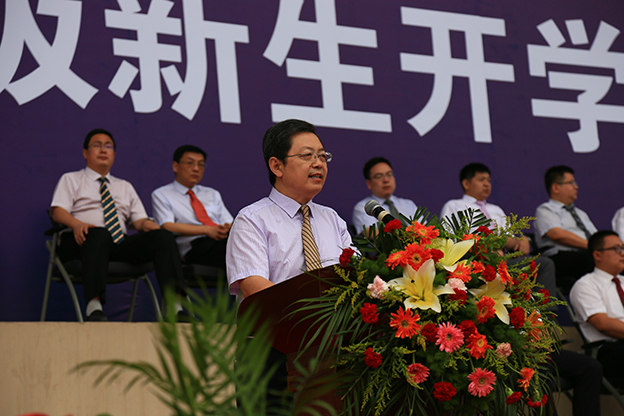 杨捷向2017级新生致辞。他对来自全国17个省、直辖市、自治区的2017级5293名本、专科新生到来表示祝贺和欢迎。他说,开学典礼好比新生和学校的签约仪式,从此大家与学校荣辱与共、紧密相连,学校将忠于育人的使命,努力为同学们的成长提供良好平台。