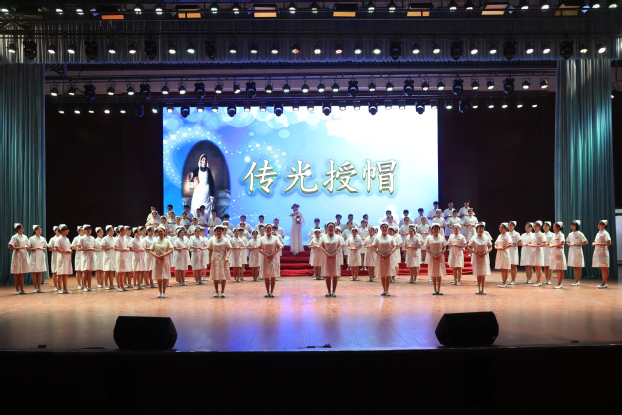 在悠扬的乐曲中,护理学院院长薛松梅为护生们传光,神圣的火种刻画着护理事业新老接替的轮回,体现南丁格尔精神的不灭光辉。在授帽环节,来自临床一线的7位护理前辈为即将进入临床实习的护生代表戴上圣洁的燕尾帽,把象征南丁格尔“燃烧自己,照亮别人”精神的火种传递到下一代护理人手中。随后,护理学院教师代表陈亚南带领所有实习生在南丁格尔像前庄严宣誓,掷地有声的誓言在跳跃的烛光中回荡。最后,仪式在慷慨激昂的合唱《中国护士之歌》完美结束。