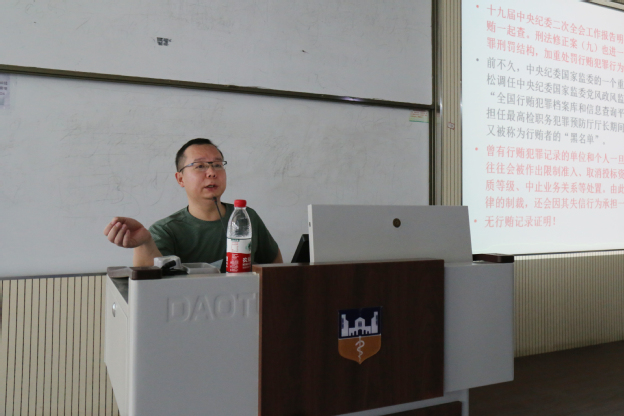 7月11日上午,郑州大学法学院教授王立志应邀到我校做“走出贿赂犯罪认识误区”的预防职务犯罪讲座,讲座在平原校区谨学楼B101教室举行,党委副书记张钢出席,各职能部门负责人及300余名党员参加。