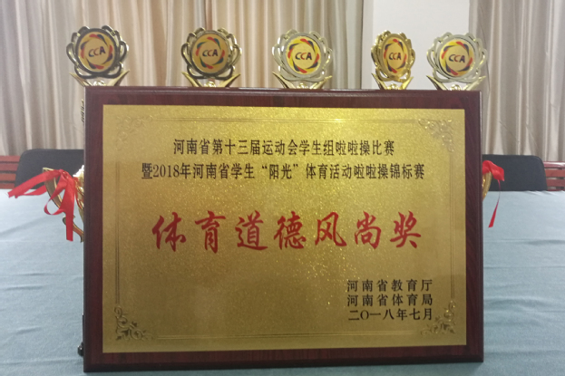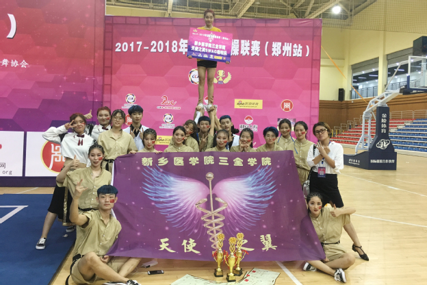 经过激烈角逐,在2018年全国啦啦操联赛(郑州站)中,我校宋山山、宋幸格等13名代表队获得公开青年两组街舞规定动作第一名和公开青年两组小团体配合技巧第一名;薛智尧和侯越伟同学获得公开青年两组双人街舞自选动作第一名;马子涵和常一凡同学获得公开青年两组双人爵士自选动作第一名。在河南省学生‘华光’体育啦啦操锦标赛”中我校代表队获得了本科甲组双人街舞第一名;王乔梓、常嘉琳获得本科甲组双人爵士第一名;齐琦、千惠两位老师荣获优秀教练员称号,同时我校获得“体育道德风尚奖”称号。