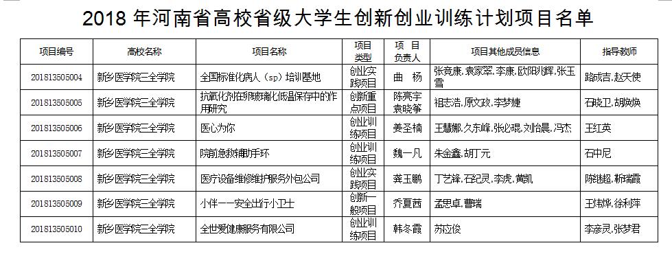 近日,河南省教育厅发布《关于公布2018年国家级和省级大学生创新创业训练计划项目名单的通知》教高〔2018〕987号,依照省教育厅规定,我校满额申报的10项“大学生创新创业训练计划项目”通过教育部和省教育厅审核并立项。其中,“人脐带间充质干细胞诱导为生殖细胞的基础与应用研究”和“基于内隐联想测验的临床医学大学生人格类型与专业认同的关系研究”2个项目入选国家级大学生创新训练项目,“全心全意”社区医疗服务中心”项目入选国家级大学生创业训练项目,“全国标准化病人(sp)培训基地”等7个项目入选河南省大学生创新创业实践项目。