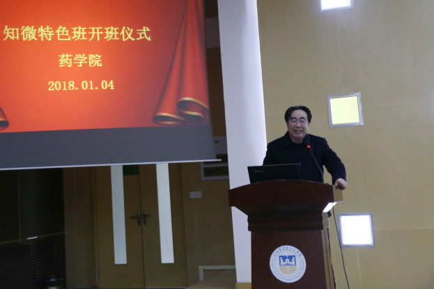 开班仪式上,闫福林代表我校药学院对知微生物医药有限公司一行表示热烈欢迎。他表示,开办“知微药学特色班”是今年我校药学院的重点工作,旨在选拔和培养专业知识过硬,实验能力强,毕业能够直接从事药物研究与开发、药物生产与管理等方面工作的专门技术人才,感谢知微生物医药公司为我校师生提供的良好平台。
