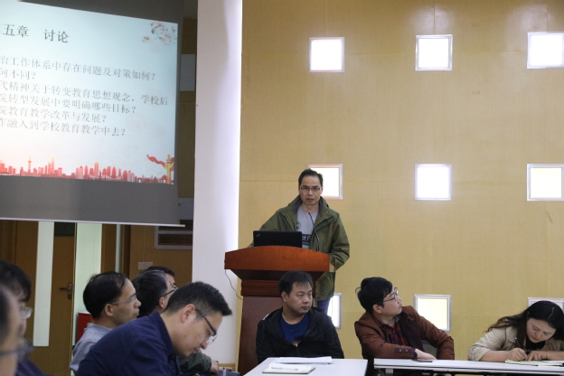 机关一党支部王德胜围绕新形势下我校思想政治工作体系中存在问题及对策发言。他说,党中央和国家对高校思想政治工作提出了“三全育人”的要求,思想政治工作要贯穿教育教学全过程,在专业教育、思政教育、活动教育等领域全面渗透;壮大思政教师队伍,在思政部和书院中合理配置关键课程;要研究、了解教育对象,学生平时有什么兴趣爱好、烦恼困惑,他们平时关注哪些媒体等,及时发现矛盾,解决问题,做到因材施教、精准教育。另外,做好思政工作,培养出良好品行的学生,必须提高教师队伍的思想政治素质,加强师德师风建设。
