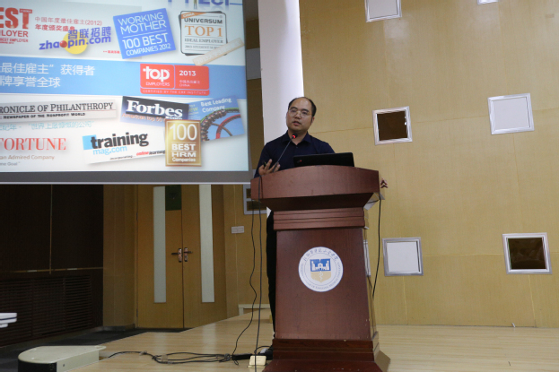 褚福代表辉瑞投资有限公司发言,他向同学们介绍了公司的基本情况及当今医药行业的发展趋势,详细介绍了进入该公司后的薪资待遇、培训的相关事宜、工作内容及人才需求,并向同学们分享了自己在辉瑞的工作经历与收获。他表示,此次“辉瑞班”的开班不仅是三全学院的大事更是辉瑞投资有限公司的大事,希望我校学生通过在“辉瑞班”的学习能更明确自己的职业规划,书写属于他们的壮丽篇章。