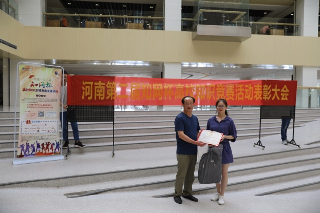 本次比赛以网上报名参赛答题的形式进行,河南省参与高校达76所,参赛学生近3万人,经过一个月的激烈比拼,我校共参与学生114人。为表彰我校取得的优异成绩,同方知网(北京)技术有限公司河南分公司特于6月19 日来到我校,代表河南省高等学校图书情报工作委员会在图书馆一楼中庭举办了颁奖仪式,图书馆馆长华玉民作为颁奖嘉宾为获奖学生颁奖。据悉,本次比赛特等奖全省仅此两名,我校殷凯同学占据其一。