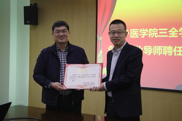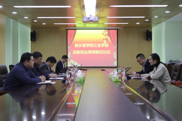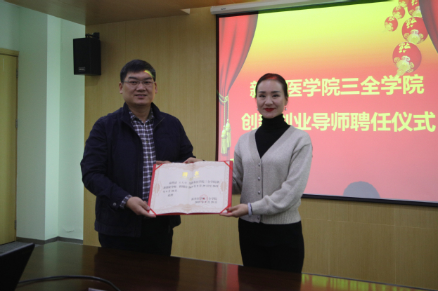 启动仪式前,我校在行政楼第三会议室进行创新创业导师聘任仪式,邱永建为王允妆和贾岸松颁发我校“创新创业导师”聘任证书并合影留念。