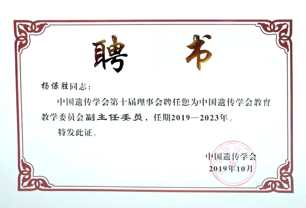 近日,从中国遗传学会获悉,我校基础医学院杨保胜教授当选中国遗传学会教育教学委员会副主任委员。这也是我校基础医学院继加入中国高等教育学会医学教育专业委员会基础医学学组之后,再次加入的另一个大型社会团体。
