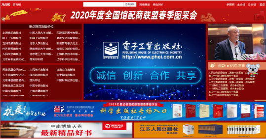 4.1、主会场:右上角展示相关人员讲话及平台消息发布。其他板块主要展示重点出版社书目,直接点击出版社名称即可进入选书界面。