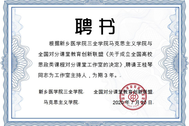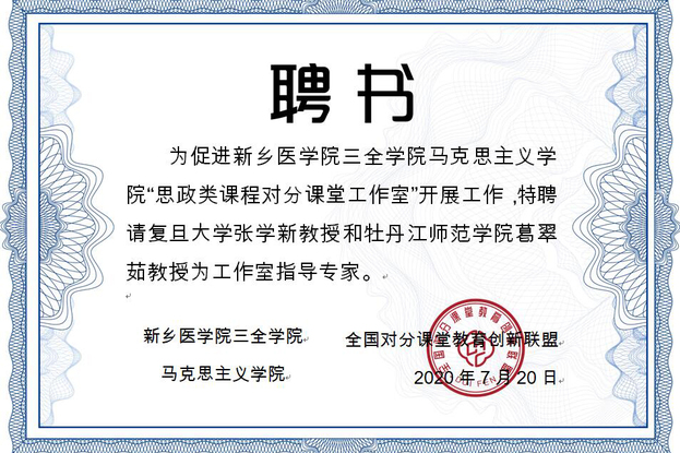 7月20日,新乡医学院三全学院马克思主义学院与全国对分课堂教育创新联盟合作共建 “全国高校思政类课程对分课堂工作室”。马克思主义学院王桂琴老师为工作室主持人,并聘请复旦大学张学新教授、牡丹江师范学院葛翠茹教授作为工作室指导专家。