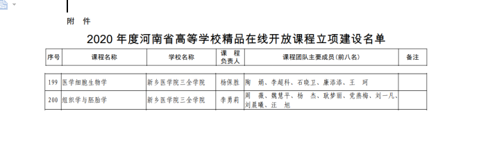 我校根据《河南省教育厅关于遴选省级精品在线开放课程的通知》文件精神,积极组织申报,经院系推荐,学校遴选,省级评审,最终我校杨保胜课程团队的《医学细胞生物学》和李勇莉课程团队的《组织学与胚胎学》两门课程获得省级立项。