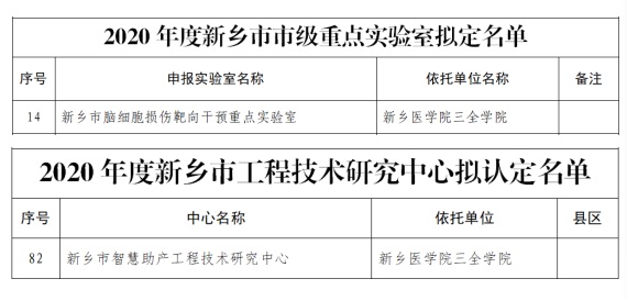 近日,新乡市科技局公布了《关于2020年度新乡市重点实验室评审结果》《关于2020年度新乡市工程技术研究中心评审结果》,我校共计获批建设项市级平台,其中包括基础医学院的“新乡市脑细胞损伤靶向干预重点实验室”和护理学院的“新乡市智慧助产工程技术研究中心”。