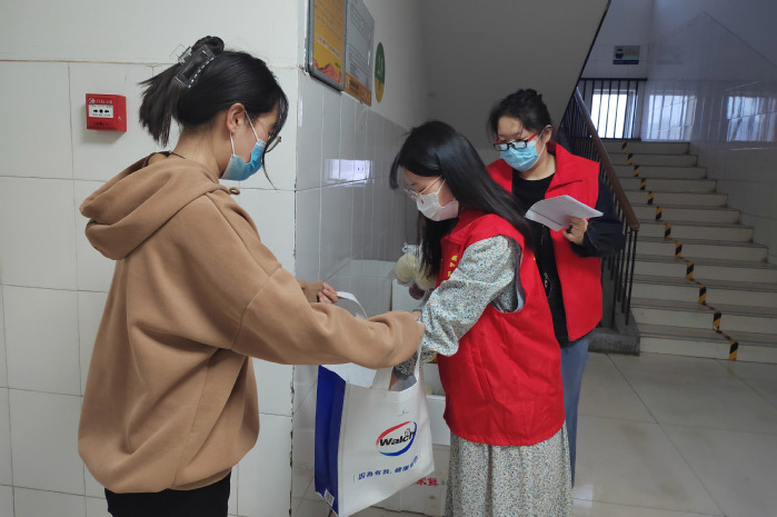 实行学生网格化管理,精准摸排18935名学生,核查重点人群,确保底数清、情况明;辅导员们毅然走进封控区,选择和学生们在一起,他们通过线上班会,安抚学生情绪,深入宿舍和同学们谈心谈话,做好心理疏导,全力保障隔离学生正常生活。封控楼内的学生党员、团学干部等火速成立志愿者服务队,共计200余名,他们在做好自身防疫的同时挺身而出,分发餐饭、物资发放、协助核酸检测等,以实际行动践行志愿者的“社会责任”。