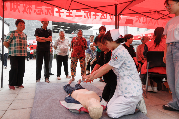 爱心义诊摊位前也排起了长长的队伍。在我校红十字会志愿者的引导下,村民们有序等待,来自我校护理学院的老师们耐心为大家提供量血压、测血糖、心肺复苏急救科普等服务。“先生怎么了,先生怎么了,患者无意识,1001,1002,1003,1004,1005……”年轻人对心肺复苏的学习欲望很高,在志愿者的示范下,他们有模有样地学着。