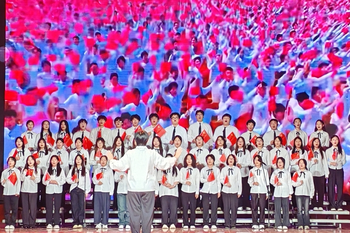 “夜半三更哟盼天明,寒冬腊月哟盼春风……”一曲悠远深情的《映山红》拉开了红歌会的序幕,将观众的思绪带回了那段烽火连天、渴望光明的岁月。随后,激昂澎湃的《歌唱祖国》旋律响起,“五星红旗迎风飘扬,胜利歌声多么响亮”,全场师生自发起身,挥动着手中的国旗,放声高歌,用最真诚的嗓音唱出对祖国的无限热爱与自豪。