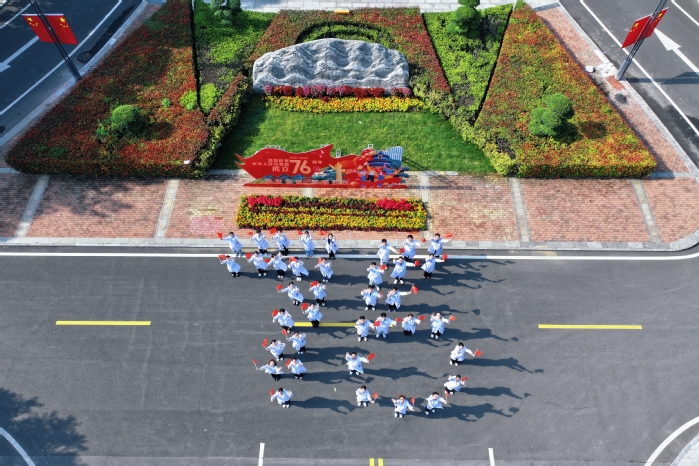校园里,数百名学子手持鲜艳的五星红旗,在校园广场上迅速集结,共同组成了一个巨大而醒目的“76”字样。这简洁有力的数字,是全体仁智师生对新中国76周年华诞最炽热、最直接的献礼。参与活动的兰斐斐同学激动地表示:“当我举起国旗,成为‘76’一部分的那一刻,心中涌起前所未有的激动与自豪。我们不再是历史的旁观者,而是时代的书写者。” 身旁的曹一涵同学也深有感触:“每一个站定的点位,都像是我们这代人的历史坐标。汇聚成‘76’,让我真切感受到了个人与祖国之间最深的情感连接。”