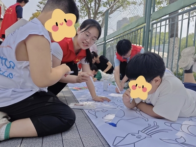 队员们精心策划的游戏环节正式登场。每一个游戏,都如同搭建起一座心灵沟通的桥梁,每一次互动,都在一点点融化孤独症儿童内心深处的坚冰。队员们带领星宝们来到户外篮球场,通过参与游戏活动来增强他们的身体协调性,星宝们努力地理解游戏规则,尝试与他人协作。每当他们遇到困难,队员们都会毫不犹豫地伸出援手,给予他们最热烈的赞扬。在活动的最后,星宝们纷纷拿起画笔,围绕 “海洋主题,共同绘制一幅承载着希望与梦想的 “心中的大海主题画。在绘画过程中,星宝们亲密无间地交流着,互相分享自己的想法。孤独症儿童用他们独特的视角与色彩,尽情地表达着内心深处的情感,广海幼儿园的小朋友则充分发挥自己的想象力,为画作增添丰富多样的细节。