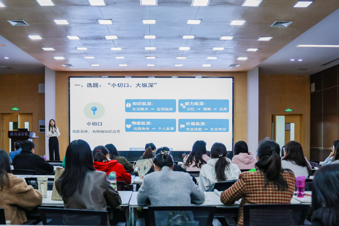 会上,四位获奖教师分享实操经验:乔美琪(全国护理教育青年教师授课竞赛二等奖、校级课堂教学创新大赛特等奖)以《老年护理学》为例,拆解从“上好一堂课”到“上好一门课”的竞赛教学设计转化方案;王双双(河南省课堂教学创新大赛二等奖)围绕“赛事相长,守正创新”,聚焦教学问题解析备赛要点与实效提升路径;熊欢欢(河南省教学技能竞赛一等奖)以“备赛=补短板”的理念,阐述竞赛对课堂质量与教师发展的双向促进;冯芊颖(校级实验教学创新大赛决赛选手)结合《外科护理学》,紧扣实验教学“安全第一”底线,融合智慧教学方式,探索实训教学创新。